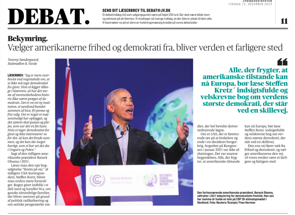 Læser man den nye bogudgivelse ”Storm på vej ” af tidligere USA-korrespondent, Steffen Kretz, bliver man endnu mere foruroliget. Bogen giver indblik i et delt land og handler bl.a. om ganske almindelige familier, der bliver uvenner på grund af politisk radikalisering og om uetiske pengestærke medier, der hel bevidst skriver vedvarende løgne.