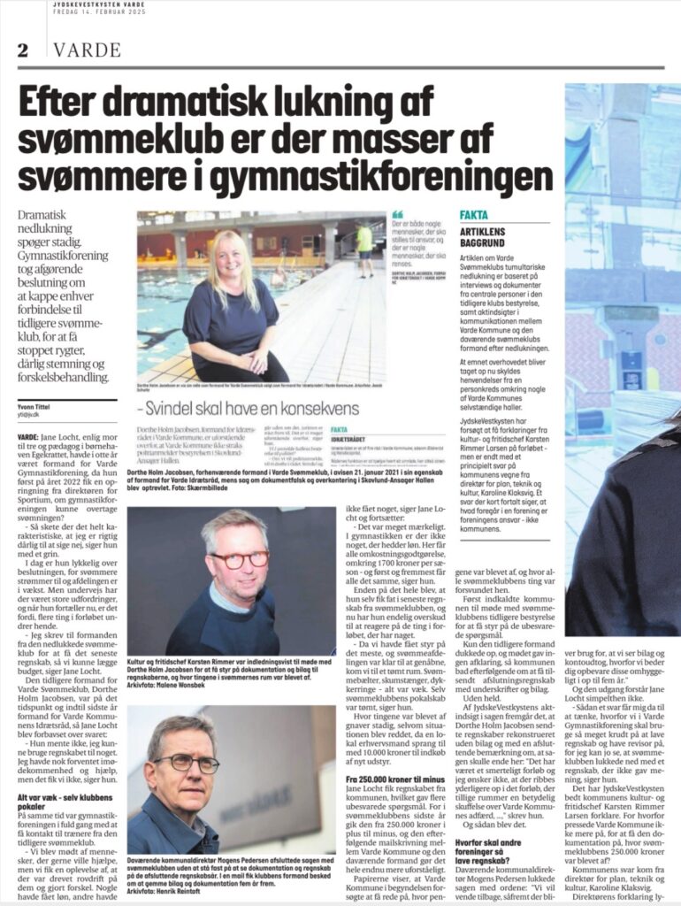 Her den seneste artikel om den dramtiske lukning af svømmeklubben – JydskeVestkysten, den 14. februar 2025.