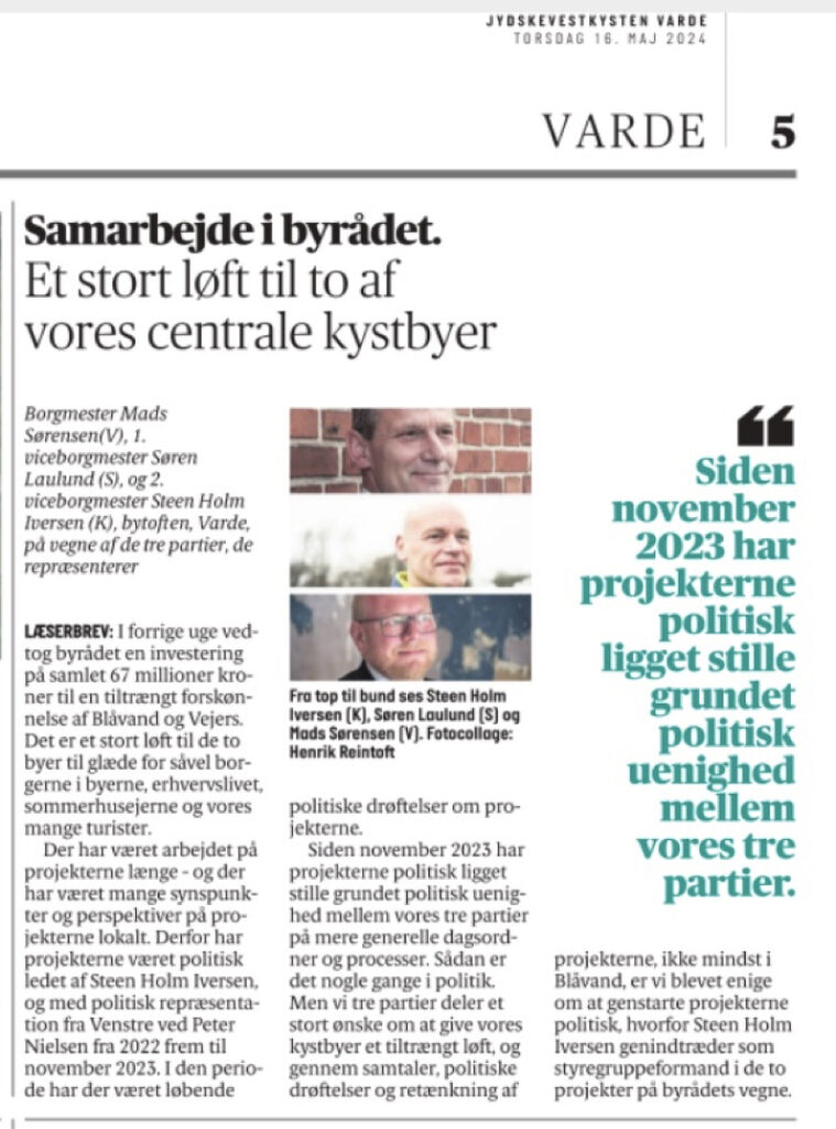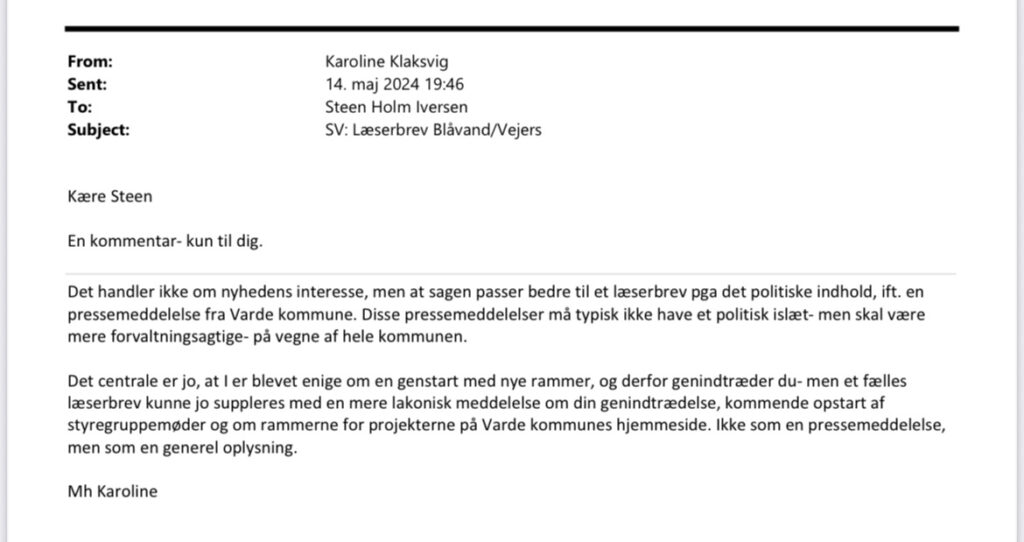 Her nedenfor læserbrevet, der skulle camouflere den indgåede studehandel. Læserbrevet af den 16. maj 2024 er udarbejdet med rådgivning fra en forvaltningsdirektør, jf. den optrykte mail af 14. maj 2024 (optrykt ovenfor). Den ”fiktive” og betalte vikariering som borgmester dækkede reelt over betaling for formandshvervet i Blåvand/Vejers projektet, men det kommer ikke frem i læserbrevet her fra den 16. maj 2024. Det var Gotommy.dk, der undrede sig over det påfaldende ”gode samarbejde” og ikke mindst over, at der ikke blev oplyst noget om aflønning i læserbrevet. Det kom først efterfølgende og modvilligt frem i flere aktindsigter. Borgmesteren nægtede i første omgang, at der var tale om betaling for hvervet som formand i Blåvand/Vejers projektet. Men den gik ikke, og så rullede en af de største politiske skandaler i Varde – med voldsomme politiske konsekvenser til følge.